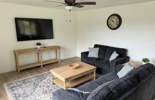 This cute red brick rambler has 2 beds and 1 bath. This home has recently been remodeled with new furnishings, while also keeping some of the charm and character of the original home. Our home offers private Wi-Fi, Smart TVs in the living room as well as bedrooms, fully equipped kitchen, & washer/dryer. Each bedroom features a queen-sized bed. The living room has a pull-out couch to accommodate additional sleeping space. A pack and play is also available and kept onsite. The backyard features a covered porch, patio, BBQ & fire pit. This home is in an excellent location to set up your base camp for exploring the many national parks nearby.