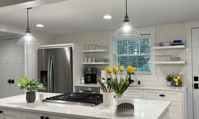 Kitchen has gas range, and all stainless steel appliances. We've done our best to stock the kitchen with all the necessary items as well as a few extras such as an airfryer and programmable combo drip or k-cup coffee maker. But, if you find there is something special you need, we're happy to lend you anything we have.