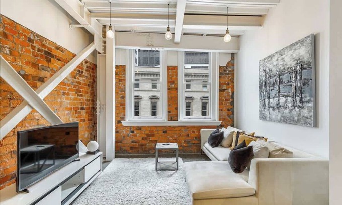 In the living area, unwind on the comfortable couch while enjoying your favorite shows on the Smart TV, all with the stunning city views of Queen Street right outside the window.