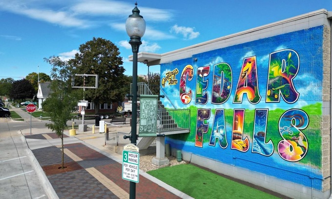 Take a picture by the beautiful Cedar Falls mural on the south side of the building created by an area artist.