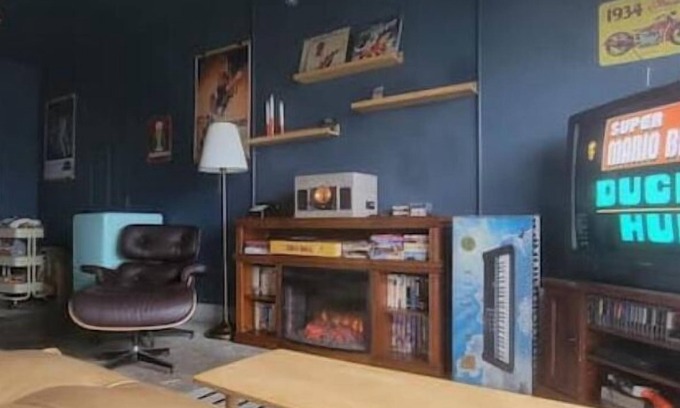We've turned the garage into a laid-back game room, stretching across the entire space of two garages, so there’s plenty of room to spread out and enjoy. It's packed with a mix of nostalgic and classic games—pinball, an arcade machine with over 1,700 games, air hockey, and ping pong. There's a vintage CRT TV stacked with old VHS tapes and DVDs, plus some retro Nintendo games if you're in the mood for that throwback feel. A vending machine with movie snacks and fun items, a cozy leather couch, and an electric fireplace make it an easy spot to unwind. We've also set up a media station with a stereo / radio and a collection of records and cassette tapes, perfect for playing tunes and setting the mood while you hang out.