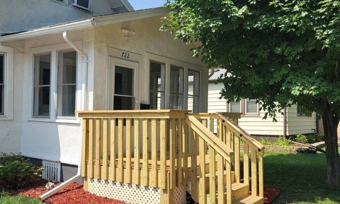 Entertain your group at this full home on the edge of downtown Fargo, only half a block from 701 Eateries, Fargo Brewing, and a grocery store. 5 bedrooms, 8 beds, 2 couches.