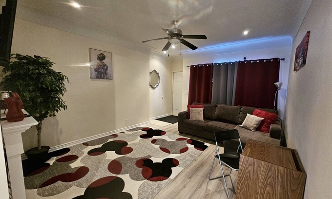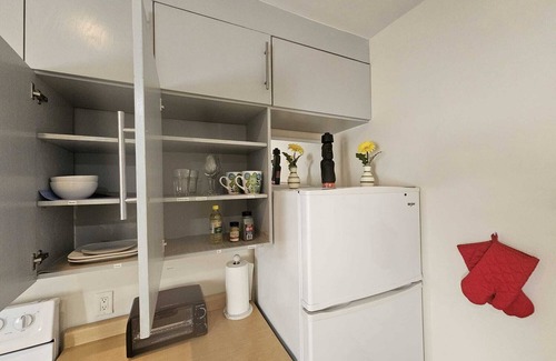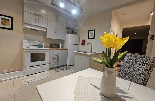 carpet that enhance the red decor of the living room. The bedroom offers a queen size bed with a walk in closet, dresser with a fancy lamp & flower. There's a clean full size bathroom with plenty of light & a clear bowl sink. Full kitchen, brightly lit with the basic necessities for you to cook. A dinning table with two chairs that add a touch of elegance to the space where you can sit & enjoy your meals. In the space there is dedicated phone charging station. Lots to do & see in Hamilton from; Canadas first Tim Hortons, Gage park, Bay front park, Dunburn Castle, Farmers market, Tiger Cats football stadium, Cherokee golf club, plenty of night life with great cafes & restaurants. Not to mention the many waterfalls and hiking trails.
