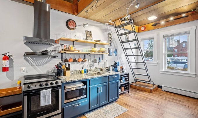 Additional amenities include a wireless lock for easy access and a reserved parking spot in the public lot right next to the condo complex. However, please note the following disclosures: the unit is unsuitable for children under 10, and the loft bedroom may pose challenges for those with mobility issues due to steep and narrow stairs. Outside cameras are used for security, and being in the heart of downtown means occasional city noises. While a parking pass is provided, availability in the public lot can vary, and you may need to move your vehicle for plowing during snowstorms. Paid parking is available on weekdays from 8 am to 8 pm, and free parking is available outside the unit at other times.