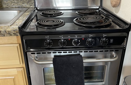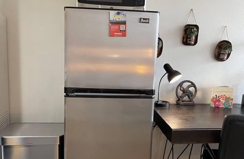 The kitchen area is equipped with a stove, microwave, regular fridge/freezer, coffee maker, air fryer, pots, pans, utensils, and more. Simply stock your own food. Check the amenities section for a complete list of provided items.