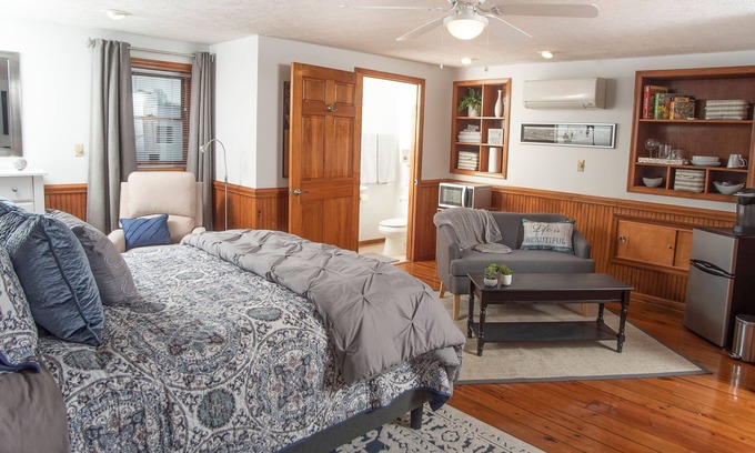 Prime location in the heart of historic downtown Lynchburg steps away from your reserved parking space, community market, visitor center, restaurants, shopping, businesses, and walking and bike trails. This ground-level studio near the corner of 12th and Main is packed with modern amenities; a queen bed, 58" Roku TV, settee, mini fridge, microwave, bathroom, walk-in closet, blackout drapes, and sound deafening interior storm windows. Approx. 10 min from all local colleges.