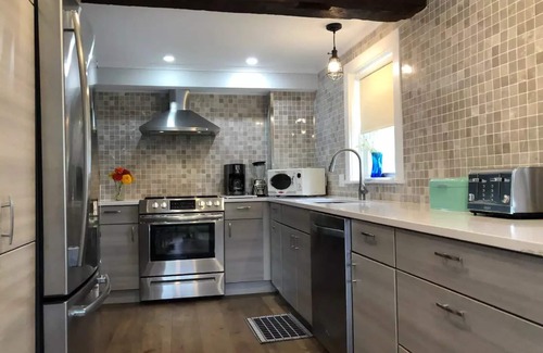 For dinner, the kitchen is cook-ready, with a long dining table for your fixings or take-out food. Better yet, walk less than 5 minutes and take your pick of 7 locally-owned restaurants along the way.