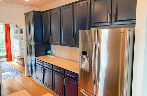 As the morning light pours through our custom plantation shutters enjoy cooking in our fully stocked kitchen (see photos). Kitchen has custom cabinetry, subway tile backsplash, quartz countertops and stainless steal appliances.