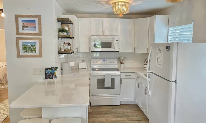 Coastal Chic Cottage close to Downtown Stuart, beaches, shopping, & dining! Located off East Ocean near Riverside Dr and steps to waterfront Hildebrad park! One block from Cleveland Clinic North! Unit has been completely remodeled, furnished, and updated from floors to ceiling. Comfortably sleep 4 guests: 1 Queen bed, 1 King bed. No restrictions for parking vehicles, separate laundry room with washer/dryer, attached screened in back patio! One shared wall with adjoining unit-completely private!
