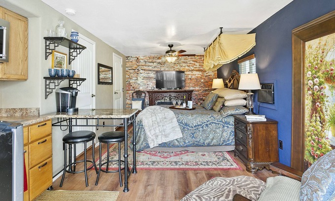 Gorgeous, private, recently renovated studio guest house with secure parking, private entrance, and delivery gate with doorbell. Super comfortable Purple 3 Hybrid Queen mattress with high-end linens. Soothing electric fireplace, flat screen TV, blu-ray player, dozens of DVDs, high-speed internet. Fully equipped kitchenette with oversize mini-fridge, convection microwave, induction plate, Keurig, coffee station with assortment of flavored coffees, teas, syrups, and sweeteners. Efficient, small bath with fully tiled shower. Oversized clothes closet. Peaceful, private patio with bistro set and fountain. Beautiful, quiet yard with premium furnishings and ambient lighting.