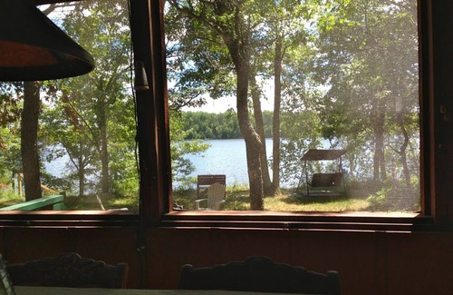 This rustic retreat is located on 8 acres of lakefront property. There is a small beach, private dock, raft and access to a small 4 person pontoon boat, 2 canoes, and a paddle-boat. Enjoy fishing, swimming, tanning on the dock, hikes along our private trails, or reading a book on our family size screened porch! Fall asleep listening to the wind rustling the leaves, the night calls of the loons, or the water lapping at the shoreline. Plenty of wildlife to observe and endless bird watching.