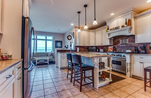 From the front entry door, you'll enter the spacious entry room with closets to hang your coat and a spot for your shoes. To the right you'll find the first floor half bath and laundry. You'll enter the Kitchen with all of the amenities you'll need for preparing your home-cooked meals. The Kitchen is fully stocked with cookware and dinnerservice for 10 persons and has a spacious Island with bar stools for spending time snacking together or watching the cook make meals. There is a small sitting area on the one end of the Kitchen, with windows looking out over the lake.