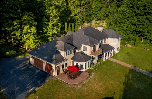 Dragonfly is set on several acres of private land, tucked beside a private vineyard that belongs to the home, and has 500' of private beach and a private pickleball court. Pulling in the driveway from the road, you'll immediately feel like you are transported into your own quiet paradise. You'll drive in the long paved driveway, crossing over the meandering stream via a bridge or two and pull up to the house. The house is set in a rural wooded area, so you will encounter wildlife: you may see some deer, squirrels, raccoons, etc and you will definitely see plenty of ducks and geese on the lawn and in the water--these are all just a part of lake life in the country.