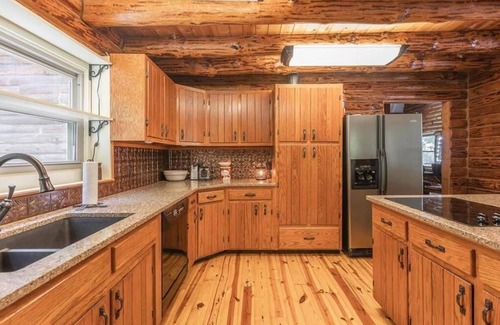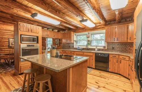 Two-story log cabin with 10 beds and a fold-out sofa can accommodate up to 18 guests. Wall-to-ceiling wood encapsulates your entire experience - 8-place dining room, full kitchen with granite countertops and modern appliances, and a spacious living room with two couches and a recliner. All the comforts of home.