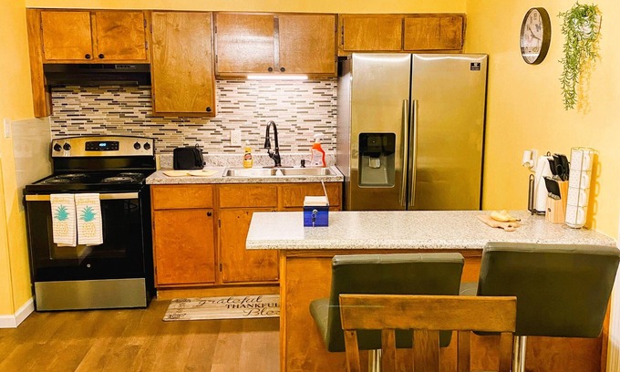 Located in a peaceful neighborhood of longtime middle age to elderly neighbors who are willing to help with any questions. This home is completely renovated and modern to suit all your family needs with high speed wi-fi, Bluetooth and usb ports in every room, smart tvs and movies galore channels in every room, family games, all new bedding and mattresses. The home consist of 3 bedrooms with black out curtains, a full size, queen size and last bedroom has 2 twin beds. Also, there is no carpet in entire home. There is plenty of parking at this private residence. The kitchen is stocked with all essentials to make a gourmet meal, pots and pans, spices, dinnerware and utensils, coffee and tea, condiments, and refreshments to get you started. There is a washer and dryer on premises, iron/board, towels, soap, toiletries, hair dryer, cleaning supplies, microwave, and area for grilling with a large backyard. The home has plenty of lighting and security cameras on outside. There is a smartbox located on door for self check-in. Most importantly, you are less than 2 miles from historical downtown attractions and eateries.