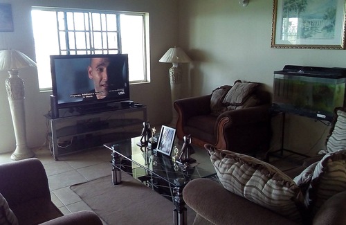 The room is large and has 1 bed. it can accommodate 2 persons. If you want additional beds that can be arranged. lots of luxury and things for your comfort. there is also hot and clod water cable tv wifi internet and a desk top computer, living room ,dining room kitchen,front n back veranda, garage space Driver available if needed. Airport pickup if requested. City view and highway view is its best features.