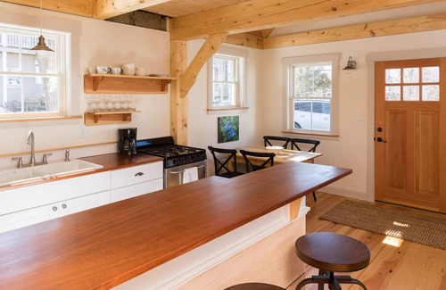 Newly constructed post and beam get away has a private patio with a gas grill and dedicated parking. Comfortable, all new furnishings. Full bath with washer and dryer, loft bedroom with queen bed (sleeps two) and a first floor pull out couch for an extra guest. Smell the sea breeze, walk to the coffee shop before strolling to the harbor-side park or beach. Decide which restaurant you want to walk to for dinner and enjoy an evening cocktail on the private patio.
