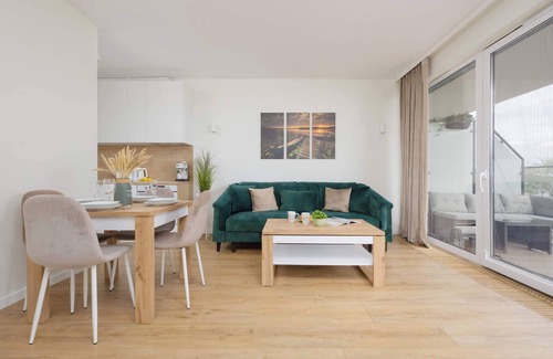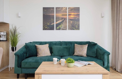 Located on the third floor of a modern building with an elevator, the apartment is an excellent choice for couples and families with children who value comfort, aesthetics and proximity to nature. The 46 m² space is furnished for the comfort of up to four people. The interior, decorated in light, natural tones, with elegant accessories and decorative accents, has been planned with attention to detail, creating a cozy and stylish atmosphere conducive to relaxation. The living room features a stylish sofa in a shade of bottle green, a large Smart TV with cable access, and a dining table where you can enjoy a meal together or comfortably work remotely. The living room leads out to a private balcony furnished with garden furniture, an ideal place for morning coffee overlooking the lake or evening relaxation. Comfort on warmer days is provided by a chandelier with a fan. The kitchenette is fully equipped with an induction cooktop, oven, dishwasher, blender, cob coffee maker and microwave oven, allowing you to prepare both quick breakfasts and full home-cooked meals. The bedroom has a large, comfortable double bed and additional access to the balcony. Here, too, there is a chandelier with a fan, which provides pleasant air circulation. The modern, bright bathroom is equipped with a washing machine. Guests also have at their disposal an iron and ironing board, so the apartment will also be perfect for longer stays.