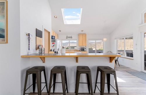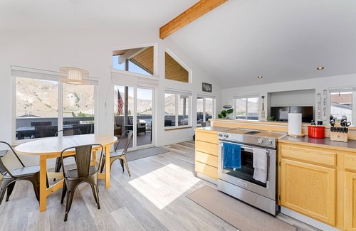 Inside the house, you'll marvel at how the sunlight streams in through skylights and walls of windows. The bright, open floor plan features new luxury vinyl plank flooring, updated furnishings and decor, and striking views of the river and mountains. The main living space upstairs brings together a well-appointed kitchen, a dining area, and a living room with a TV (with cable and streaming capability).