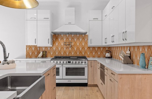 Kitchen - fully equipped main level kitchen, stainless steel appliances, double oven, teppanyaki grill, pot filler, custom cabinetry, marble countertops, breakfast bar seats 4, kitchen utensils, microwave, crockpot, blender, toaster, stand mixer, air fryer, drip coffee maker, Keurig