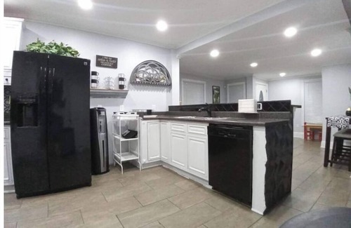The kitchen features standard appliances (stove, ice maker refrigerator, and dishwasher), along with a slow cooker, toaster, blender, coffee maker, 5-gallon Keurig water dispenser, dishes, utensils and cookware.