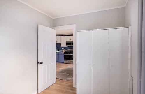 This beautiful private apartment was newly renovated to be stylish, clean and most importantly, comfortable. It is on the entire 2nd floor of a duplex, with a private entrance. The master bedroom is huge, featuring a walk in closet, king size bed and TV. The second bedroom has a full size bed and armoire. Enjoy cooking in the clean modern kitchen with brand new stainless appliances, and eat at the butcher block dining table. There is an ensuite washer and dryer outside of the bathroom for your convenience.