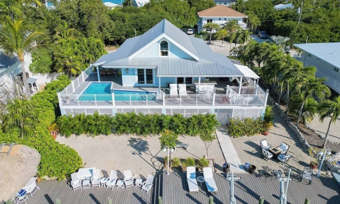 The outdoor deck is your grilling and outdoor lounging area with TV and lots of seating and a bar.The front doorleads you right into the open floor plan of the main living areas with cathedral ceilings, with the living room and dining room and open kitchen gourmet kitchen. The kitchen has a Gas Stove and oven, a convection microwave and all the kitchen tools you will need to feed a crowd. The dining room has 10 chairs for the table plus 4 bar stools at the kitchen bar. The deck on the west side just past the indoor dining room has a teak table that seats 6 as well. We call this the morning porch for coffee and enjoying the view of the pool. French doors lead out to the decks surrounding the elevated pool.Walking past the kitchen, the hallway brings you to three bedrooms all with king size beds and their own TV's on this level. One bath in the hallway, that the two bedrooms share and a private bath on the master suite. In the hall there is a staircase to the loft and additional two bedrooms. Each of these bedrooms have a queen size bed. They share a bath on this level. The loft has a TV, and one of the bedrooms has a TV. There is a pullout sofa on this level with a big desk for those that need work space.Outside on the deck, there is a large grill, with outdoor seating and a TV, and a bar with 4 bar stools and a few Lounge chairs around the pool.The Carport area has a full-size refrigerator, which serves for extra drinks a bait freezer, and a 200 lb commercial-size Ice Maker.Deep waterdockage for just about any size boat with 5' draft. 45' of doCheck-in is 4 pm on day of arrivalCheck out is 10 am on the day of departureVacation Rentals of the Florida Keys provides a complimentary starter kit of soap, toilet paper, paper towels, dishwasher detergent, and laundry detergent. Guests will need to provide ongoing supplies for your stay. ckage. Boat lift takes up another 40 feet of the dock, and it is possible to use it if your boat is under 10K lbs. A bunk fee of $500.00 applies to adjust the bunk for your boat. This home holds 10 people in beds plus 2 in a pullout. .2 paddleboards are included with this rental.This home is a28 day minimumonly. You must be 29 or older to rent. (29-year-old must be present during the entire stay)This property is pet so you are required to select the pet fee option when booking if you are bringing a dog. All dogs must be approved prior to booking. There are breed restrictions due to insurance reasons. Dogs 60lbs or less allowed - must be pre approved. Pet fee is non refundable & taxable. If you are booking onAirbnb~ the pet fee will be asked for after booking as it will not be included in total cost. The fee is based on the breed & size. Dog friendly. Max allowed is 2. Failure to disclose the dogandpay the pet fee will result in a charge up to $500andasked to vacate without a refund. Check-in is 4 pm on day of arrivalCheck out is 10 am on the day of departureVacation Rentals of the Florida Keys provides a complimentary starter kit of soap, toilet paper, paper towels, dishwasher detergent, and laundry detergent. Guests will need to provide ongoing supplies for your stay. Vacation Rentals of the Florida Keys(Vrotfk) has Terms and Conditions of use for this property and all the properties we manage. As a party to this transaction, you and your partyunderstand that renting this property you expressly agree to the Terms and Conditions of Vrotfk. Once a deposit is received by Vrotfk, or through any other platform you choose to book the property, that act will acknowledge and accept these Terms and Conditions. Terms and Conditions are attached to every reservation confirmation. Terms and Conditions will be sent via an e-sign document that is required to be signed after booking.