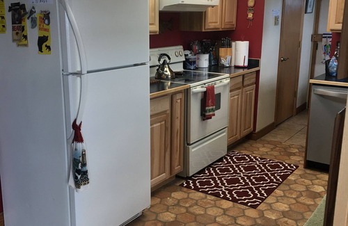 We loved the view from this lot (the lake to the east, & Glacier Park & Chief Mountain on the west), the neighbors (many professionals from all over the northwest), the fishing ( Duck Lake is one of Montana's premier trout-fishing lakes!), and world class magnificent scenery (Glacier National Park with all of its' outdoor activities) that feeds the soul. God's handiwork and His incomparable creative genius is so evident to us that it is hard to imagine not being totally in awe of this Creator of the wonderful universe! And you can enjoy this paradise without the long lines, and hustle and bustle of crowds of people! We decided to build, then found a nice home to move onto a styrofoam-formed daylight basement on our large lot. The large master bedroom has a king-sized bed, and private bath. This bedroom has a lake view. Bedroom #2 has a four-poster queen bed literally 'fit for a queen'. Bedroom #3 is our "kid's room. It features a queen sized bed. Children's books and family games are stored in the dresser there. In the closet there is a a port-a-cribs, with linens and baby monitor. A full main bath (with heated tile floor) has a tub and shower. A large living room, dining room, and full kitchen complete the main floor. A small laundry area with washer and dryer is next to the kitchen. The walk-out, daylight basement has three more bedrooms, (1 king bed, and 2 queen beds), a bathroom with a shower, and a family room with a sofa, easy chairs and a "game" area with large TV and some electronic games. There is also a connected room with a round table and chairs for board games or puzzles.