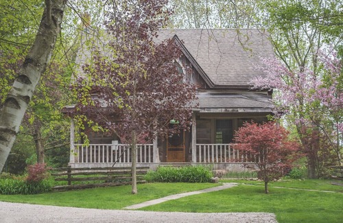 This high-end, magical getaway offers an indoor wood-burning fireplace, a fully-equipped kitchen, and a spring-fed pond all surrounded by three acres of land filled with lush trees, beautiful gardens,