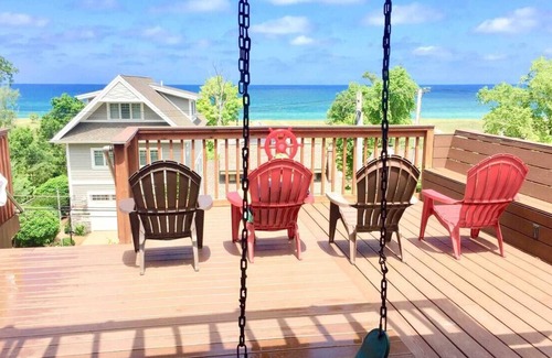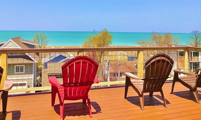 Welcome to Coastal Living Vacation Rental: Dune-Top Escape! This beachfront home is uniquely perched atop the highest Dune in Sheridan Beach, offering unparalleled panoramic views of Lake Michigan. Located adjacent to Beach-Walk resort, and directly across the street from the beach, and in the heart of The National Forest, home offers the ideal location for a summer vacation. Spend your time watching the sailboats glide the horizon to the sunsets beyond the Chicago skyline from the private decks. At Dune Top Escape, you have a front row seat to paradise, no matter the time of day. 100 years of beach goers have experienced what this rustic beach classic home has to offer and continue to make their yearly visits here. This home sits adjacent to another Coastal Living Vacation Rental "UnSalted" and shares a back driveway/path to the beach.
