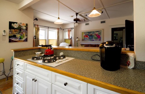 Your guest condo has a large open well-fitted kitchen with gas cooktop, refrigerator and dishwasher .....original heart of pine flooring throughout excepting kitchen and bathroom which have large Sautilla tile flooring. High ceilings, fans in every room, Mitsubishi split ductless a/c system, hurricane windows and doors, on-demand gas hot water.....