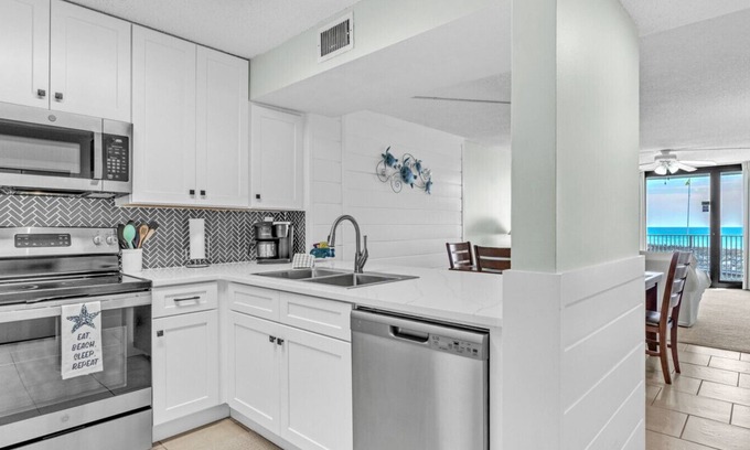 Wake up to the sound of waves in this beachfront 2BR/2BA condo at Dunes of Panama A107. Steps from the sand, it offers a walk-in shower, stainless steel appliances, and cozy coastal décor. Enjoy pools, on-site dining, and tennis, plus pet-friendly comfort for the whole family. Perfect for families, couples, or friends, this retreat blends style, convenience, and beachside fun.