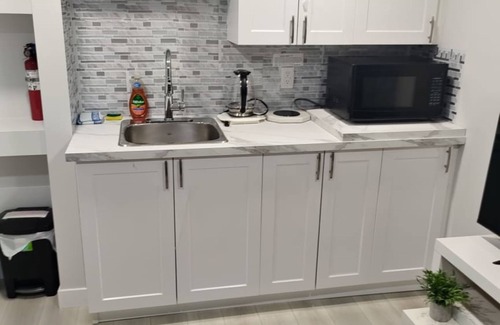 This is a tastefully furnished basement in a brand new house from the sidewalk to the private entrance, designed with the comfort of guests in mind