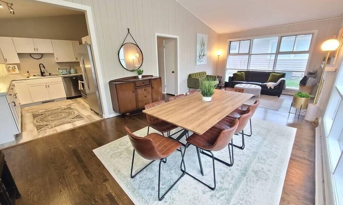 This lovely mid century modern home is set up for you to experience Miller Beach just like a local. Enjoy a day of swimming, paddle boarding, great food, bonfires, hot tub and shopping downtown Miller. This home has place settings for 10 and basic cookware and bake ware as well.