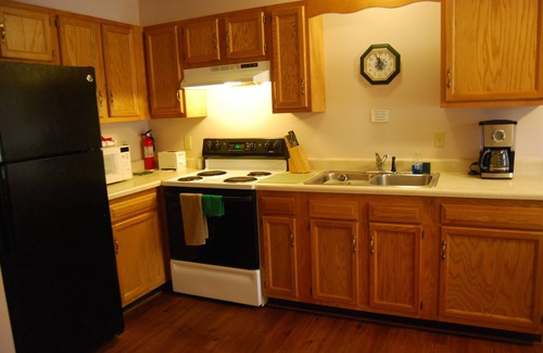 -Each side has a fully stocked kitchen. Included are pots, pans, dishes, coffeemaker and filters (you supply the coffee), refrigerator, stove, microwave, toaster and hand mixer.