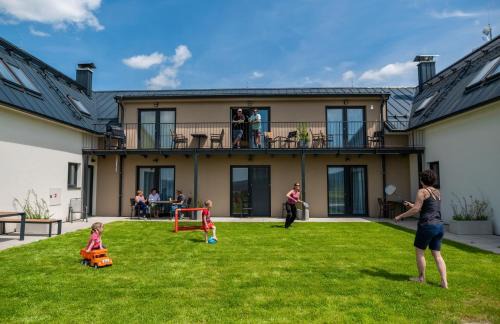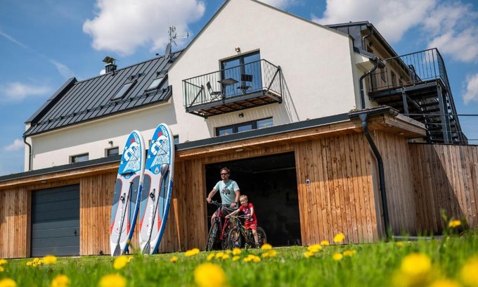 Dvě Zátoky Kovářov in Kovářov provides accommodations with a garden and barbecue facilities. This property offers access to a patio, free private parking, and free Wifi. Guests can use the sauna and open-air bath, or enjoy garden views. The apartment provides guests with a terrace, lake views, a seating area, a flat-screen TV, a fully equipped kitchen with a dishwasher and a microwave, and a private bathroom with shower and a hair dryer. A toaster, a fridge, and stovetop are also offered, as well as a coffee machine and a kettle. The rooms are equipped with heating facilities. For guests with children, Dvě Zátoky Kovářov offers a children's playground. A bicycle rental service is available at the accommodation. Castle Český Krumlov is 18 miles from Dvě Zátoky Kovářov, while Lipno Dam is 10 miles from the property. Ceske Budejovice Airport is 32 miles away.