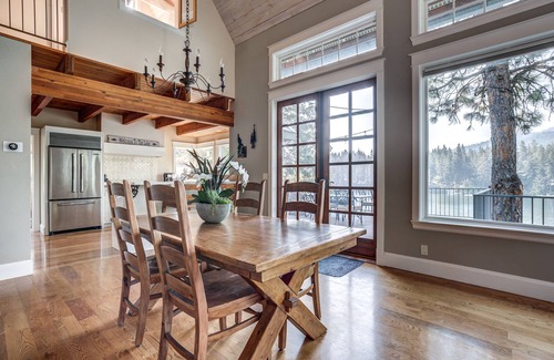 Beautiful chalet style well appointed home on the Spokane River in Post Falls, Idaho. 4 bedroom, 2.5 baths. Spacious, light, and bright. Sleeps 12-13 people...2 King size bedrooms, 1 bedroom with 2 full size beds, and 1 bedroom with twin bunks and 1 full size bed. Beautiful kitchen with expansive views from multiple windows. Gourmet gas stove. Central heating and air conditioning. Gas fireplace. Private, secluded setting yet easy access to I90, Coeur d'Alene (either by boat or car), 1 hr to Sandpoint, 30 mins to Spokane, 30-45 min to ski resorts depending where you choose to go. Close to restaurants, grocery stores, Templins Red Lion, Post Falls Brewing Company, Q'melin Park, easy access to the Centennial trail just a couple blocks away, Black Bay Park, etc. Dock for summertime fun, swimming, fishing, boating(boat not provided-but rentals available just down the street), and multiple decks for enjoying your morning coffee or afternoon BBQ. Wifi and cable TV. Smart TVs in every bedroom, beautiful office area with views to die for if work calls during your stay. Walking, hiking and biking to multiple hotspots from the house as it is in close vicinity to everything Post Falls has to offer. Wildlife abounds in this beautiful setting...it is not unusual to see osprey, bald eagles, otters, deer, and even the occasional fox comes by for a visit.