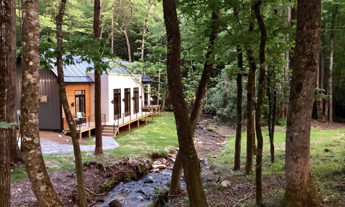 E Ranch is located 10 miles from Highlands on the Atlanta side, 10 miles from Clayton, 2 miles from Dillard, 1 mile from Sky Valley and only 2 hours from Atlanta...a great home base for all the area has to offer. It’s balconies overlook a soothing and tranquil mountain stream allowing you to relax with the sounds of nature. Walk, run, or play in your own private pasture or just relax and watch the clouds roll by. E Ranch has 3 bedrooms, 2 baths, an open living area, and a private outdoor area with shower and hot tub. E Ranch is a brand new structure blending modern and rustic elements. The property is easily accessible from a short, well graded gravel driveway without the treacherous, car punishing dirt roads you may encounter at many mountain cabins. It is located within 3 miles of stores, restaurants and civilization yet, it feels worlds away from everything. You hear nothing but the stream and sounds of nature.