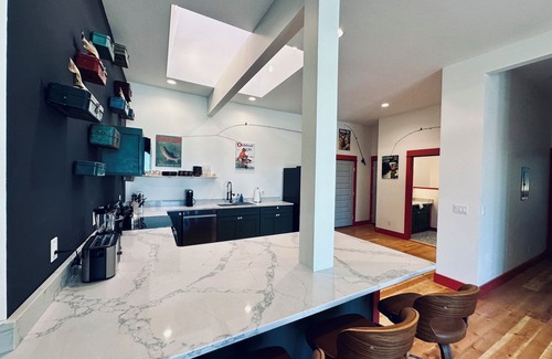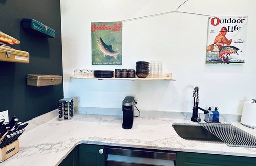 Stay at "Eagle Cap", a luxury 2nd FL condo in Enterprise's historic Litch Hotel, blending modern comfort, vintage charm and a fishing theme. It features 11 ft ceilings, original exposed stone wall in both bedrooms, wood floors, tiled bathroom, quartz countertops, locally handmade tableware, and AC.