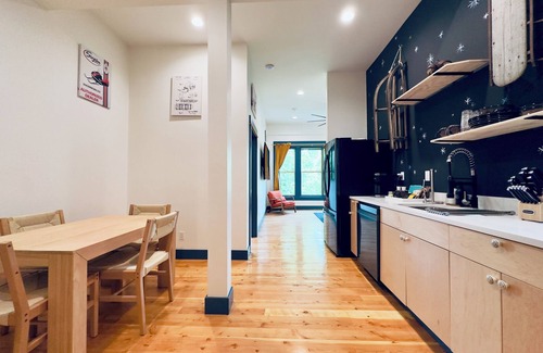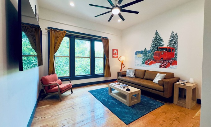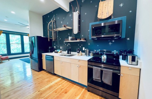 Stay at "Glacier Mountain", a luxury 2nd FL condo in Enterprise's historic Litch Hotel, blending modern comfort, vintage charm and a fishing theme. It features 11 ft ceilings, original exposed stone wall in 1 bedroom, real wood floors, tiled bathroom, quartz countertops, locally handmade tableware, and AC.