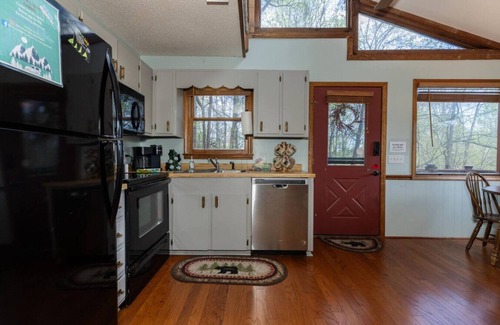 A perfect getaway for a small group. Sleeps 4, King on main floor with ensuite bath and 2 Twins on upper level with ensuite bath. Full kitchen. Awesome views from every level of this charming cabin. Wrap around deck and just one or two steps to enter.