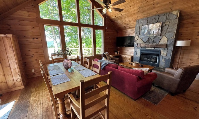 Welcome to "Eagle Ridge," nestled in the heart of the Blue Ridge Mountains. This peaceful and picturesque log home, an ultimate mountain get away for groups up to 10. The open-concept kitchen, dining, & great room, complete w/ a floor-to-ceiling stone fireplace, provide the perfect space for large groups to gather. Enjoy breathtaking year-round panoramic views and hear Cranberry /Hornbuckle creek below from the signature wrap-around deck.