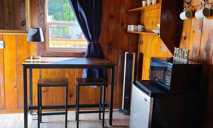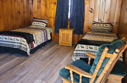This unit is a dry cabin that has 2 twin beds, small refridgerator and microwave, small indoor dining table for 2, and an outdoor patio with a small bistro set for two people. Just a very short walk to the newly redone bathrooms. ADDED BONUS - ALL OVERNIGHT GUESTS GET 10% OFF THE WOOD SHED RESTAURANT