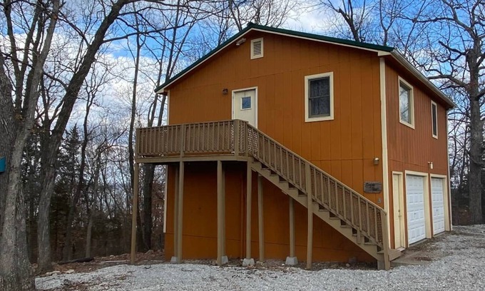 Eagle's Nest - two-bedroom cabin, one bedroom has a two full beds and the other a queen and a full, there is also a sleeper sofa and two recliners in the living room area. Fully equipped kitchen. Located above garage with outside stairs.