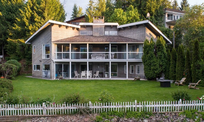Lovely 2 story home with breathtaking views of the mountains and lake from every room. Suited for family vacation or restful retreat. This home features 3 bedrooms and can accommodate 8 people. Beautiful cedar vaulted ceiling in foyer and upper level. 2 gas fireplaces, 2 decks upper and lower, backyard pergola, front yard pergola equipped with outdoor kitchen, propane bbq, bar fridge, counter space and bar seating area. 4-5 person hot tub and outdoor shower, 2 fire tables: one in front and one in backyard. The yard is ideal for young families, with a fruit stand/playhouse and sand pit for young children. Outdoor kennel at your disposal.