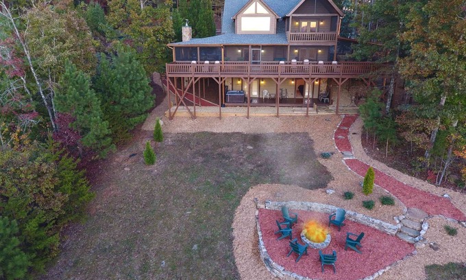 EAGLES BREEZE AMAZING MOUNTAIN VIEWS FROM A QUIET PEACEFUL NEIGHBORHOOD ! From the minute you step foot onto this property you will feel the elegance of Eagles Breeze. This 3-bedroom, 3-bath Cabin will sleep up to 10 the loft offers a Day Bed for extra sleeping for 2 guests. The cabin is located off Hwy 60 in Mineral Bluff on Bear Mountain and offers Long Range Mountain Views. As you enter the cabin you will be welcomed by the open Kitchen-Dining area and then off to the Living room with a Gas burning fireplace to enjoy. A fully equipped gourmet kitchen with commerial grade cookware is ready for a home-cooked meal to be enjoyed in, the kitchen is equiped with a state of the art Convection Microwave and a Induction Cooktop.. The Family room is located on the lower level and offers a Pool Table, Foosball and gaming table where you can enjoy a game of checkers or cards or some other board games provided. There is also a Big Screen 80 inch TV for your favorite movies with 2nd gas burning fireplace. Enjoy the outdoor wood burning fireplace located on the screened porch or relax in the 6-person Hot Tub on the patio located off the family room. Enjoy the big Wrap around Screened Porch and open sun deck with seating for the whole family to enjoy. Cook up your favorite Steak or Hamburger on the Propane Gas Grill provided. The awesome sunsets from the deck are stunning every evening. If you get tired of inside gaming enjoy a game of Horse Shoes at the Newly added Horse Shoe Pit or a game of Corn Hole located on the upper deck area. There is also a new Fire Pit located just off the Hot Tub deck where your family can enjoy making s'mores' or roasting Hot Dogs. There is so much to do you won't need to go anywhere to be entertained. Don't miss out on your stay at this beautiful mountain home. Call today and make your reservation. Call today to book your stay.