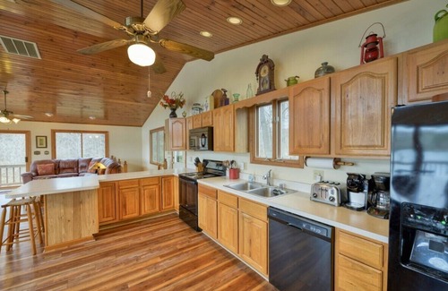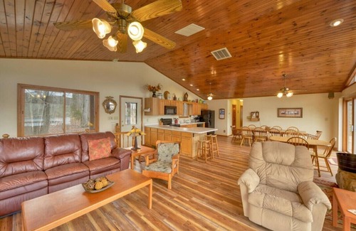The large great room seats 10 at one table for dining, with an additional table and counter seating. A fully equipped kitchen, 2 refrigerators, and gas grill make cooking a breeze. If evenings are cool, light a fire in the large stone fireplace. Enjoy your favorite TV shows or movies on the 50 inch TV, or head downstairs to the walkout family room for air hockey, shuffleboard and a 50 in. smart TV. Plenty of great books, games and puzzles for all ages can be found there, too.