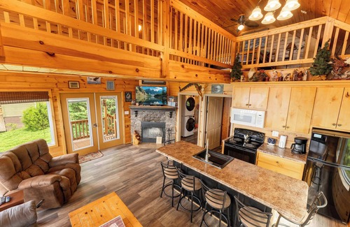 Inside, you’ll find a warm and welcoming space with a real wood-burning fireplace, fully equipped kitchen, and comfortable sleeping arrangements: a king bedroom and full bath on the main level, plus an open loft featuring a queen bed, twin bed, and full futon.
