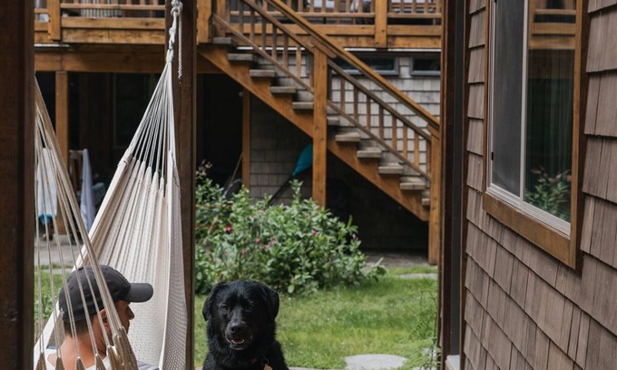 There are other toilets and shared showers located in the main house. There is also a shared commercial kitchen that you will be cooking in. There are two fridges, two stoves, two ovens, two sinks, and on freezer. There are lots of cooking supplies. There is a large front yard with lots of seating space, and a cozy living area with games and a fireplace. Mermaid Beach is just a 3 minute walk through a beautiful forested trail. There is a propane BBQ, big outdoor tables, a custom beautiful woodfired sauna, lots of yard space, outdoor games, and hammocks all for your use.