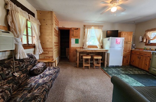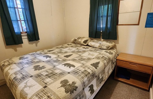 Nestled away near the edge of our property, this two bedroom cabin can sleep 7 with 1 queen size bed, 1 bunk bed with full size bed on the bottom and twin on top. It has a full bathroom, air conditioning, and is a year round cabin.